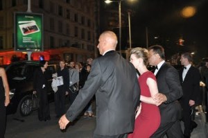 The students begin to trickle out of the glass doors at the top of the red carpet as do, to our surprise, the film’s stars. In the red dress is Van Sant’s female lead, Mia Wasikowska, being escorted out of the premiere.